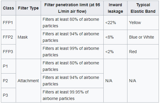 * Australian / New Zealand P2 (AS/NZ 1716:2012): similar to EU grades.